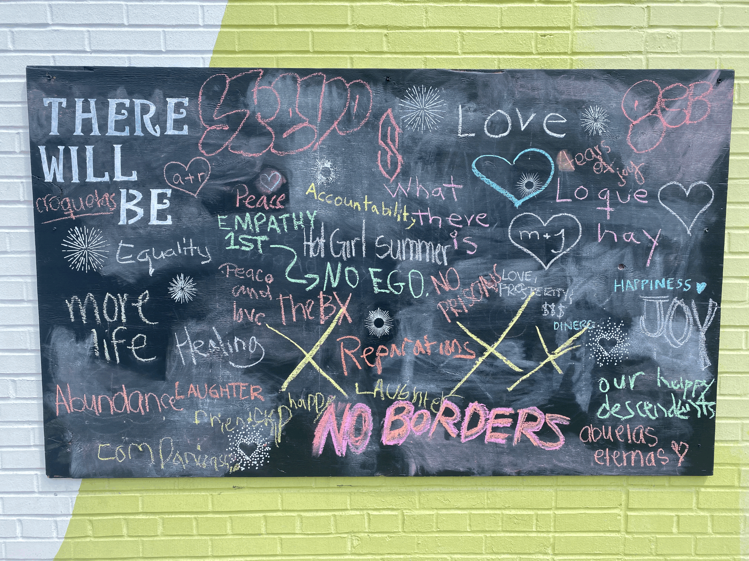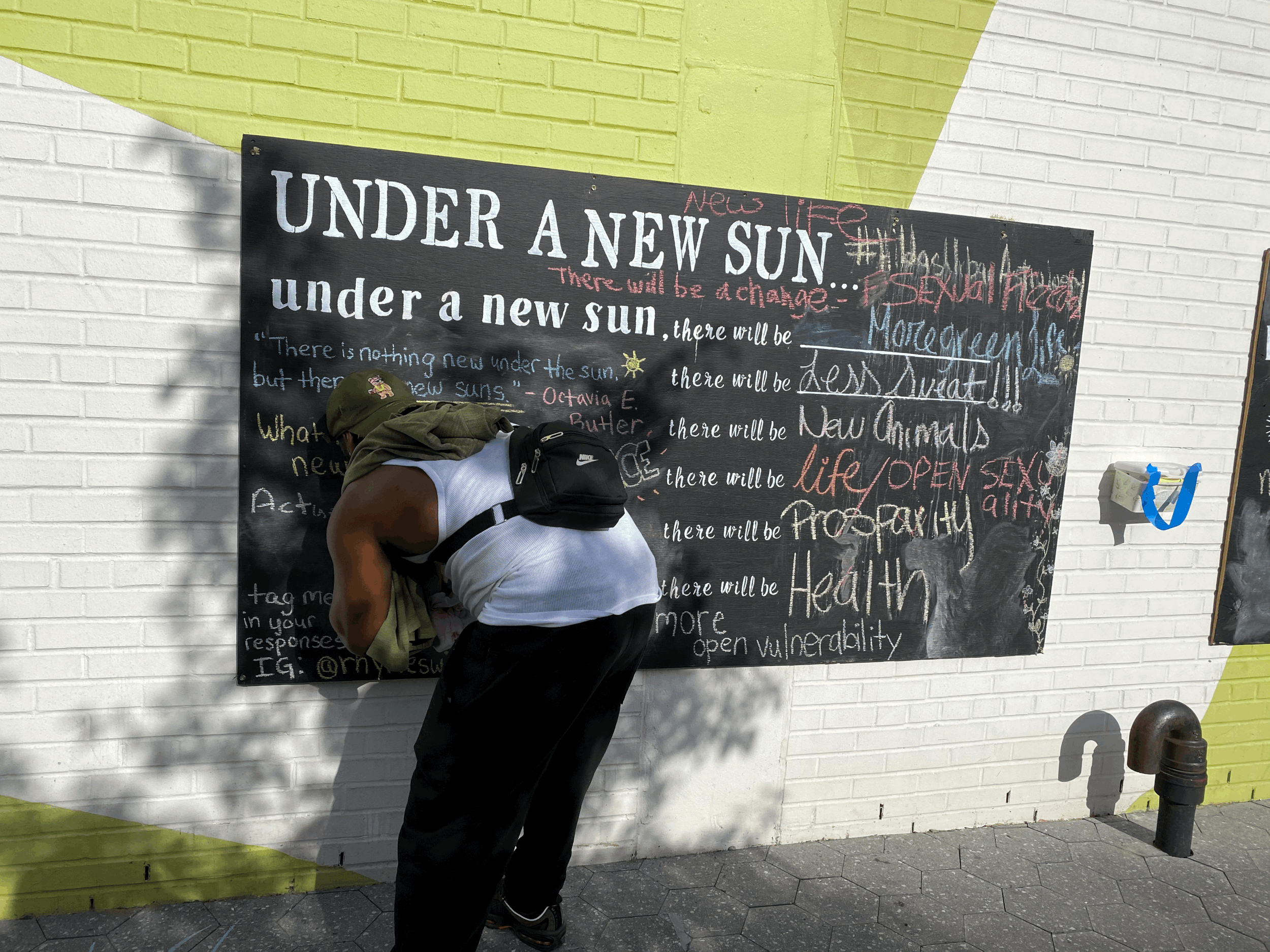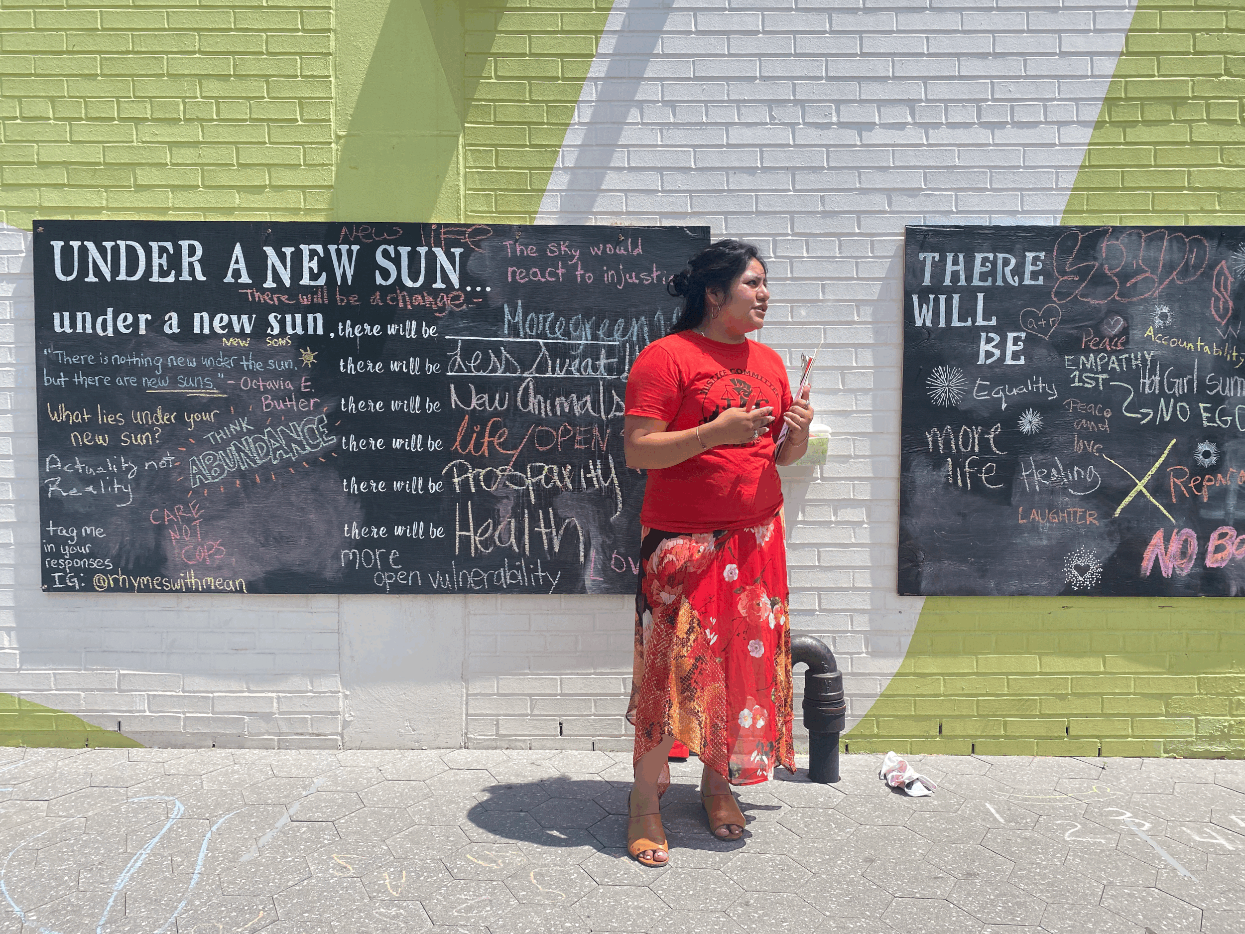 Featured in The Freedom & Captivity Coalition’s Art on Abolition exhibition; an initiative aimed at reflecting and inspiring the abolitionist imagination — art that helps community reimagine freedom; fight surveillance, racism, and stereotypes; support youth, parents, and families impacted by the carceral system; and build inclusive communities of care. “Under a New Sun” was made using plywood from the Plywood Protection Project, which aimed to recycle plywood that was posted up by storefronts in the face of the Summer 2020 uprisings. The chalkboards bear prompts inspired by Octavia E. Butler’s quote, “There is nothing new under the sun, but there are new suns,” which compels us to imagine more radically caring and more just futures. The chalk sits waiting for community members to engage and write in what they imagine to exist ‘under a new sun.’
